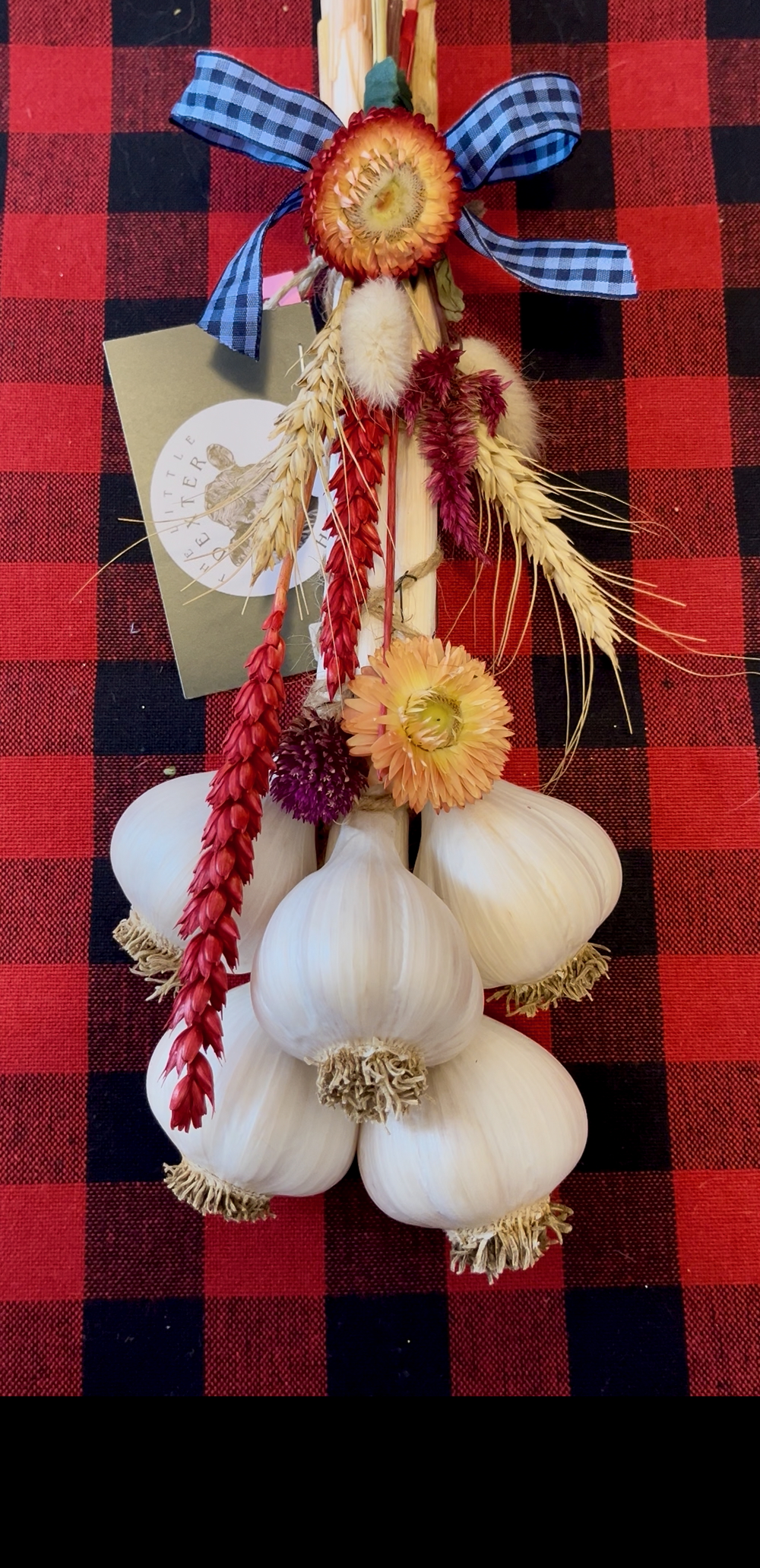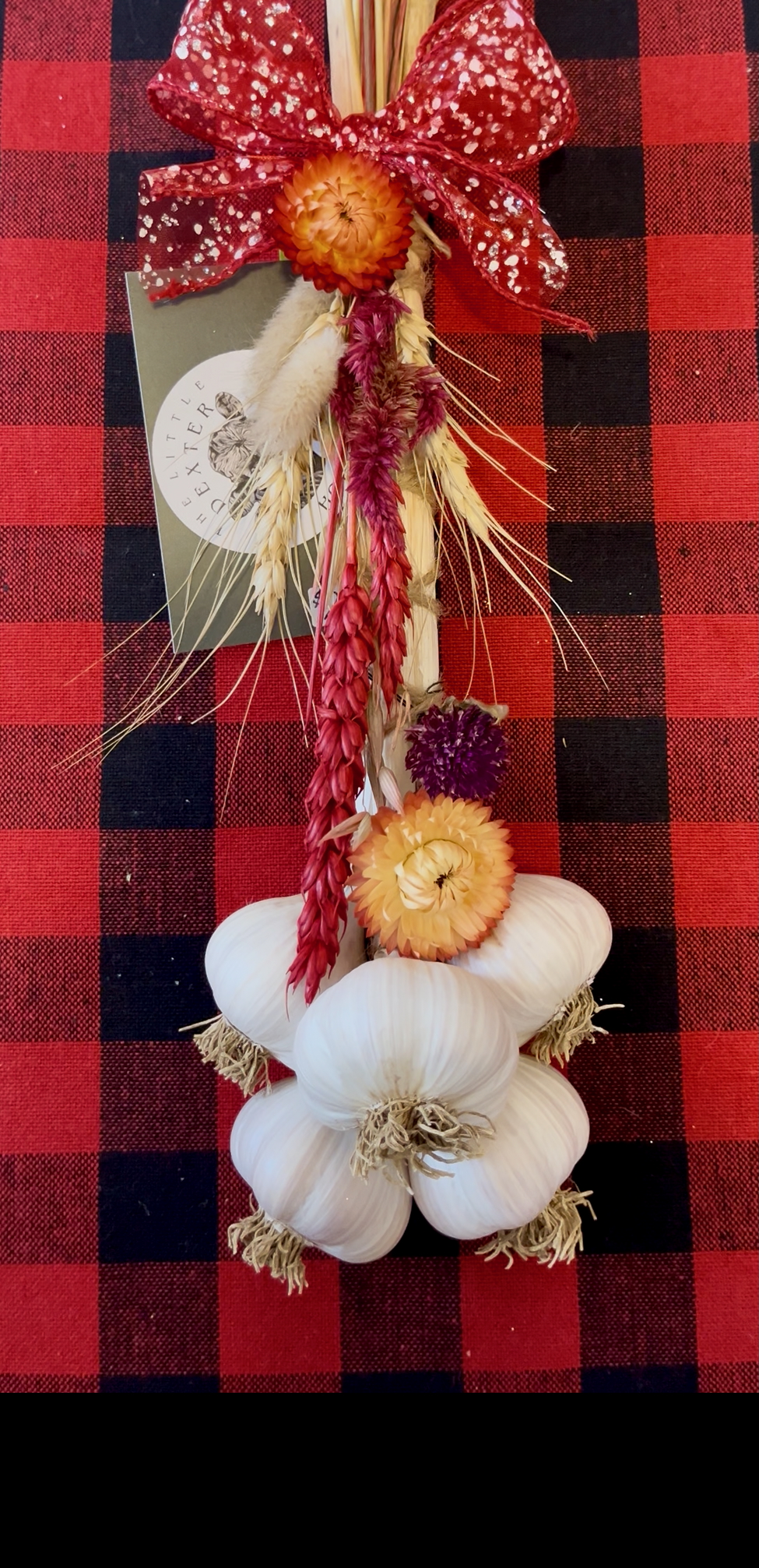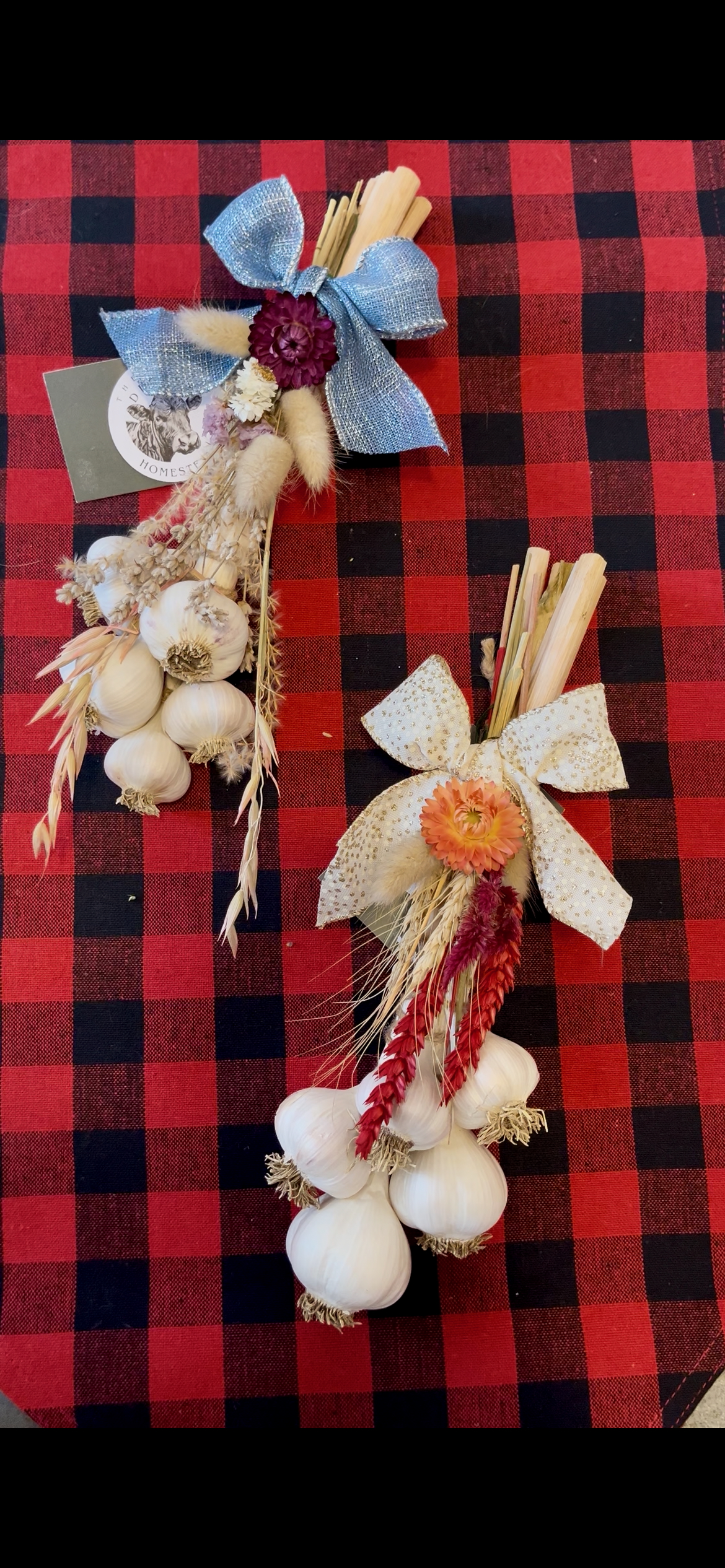 We are excited to share with you that we have some garlic braids decorated up for the holiday season. These make great gifts as they are wonderful to look at and when you are ready, they are good to eat! They are also priced right at only $15-$25. Get one! get two! get some for the whole family!